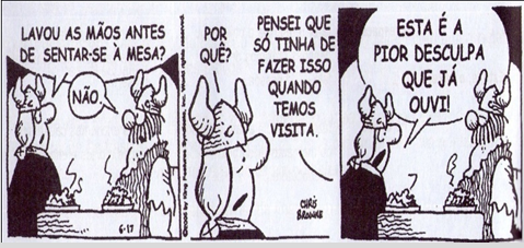 Esta interpretação é confirmada pelo contexto da tirinha, onde se observa que a personagem estava seguindo instruções anteriores sobre higiene antes das refeições, mas demonstra surpresa ao perceber que havia outras expectativas além daquela ação específica.
