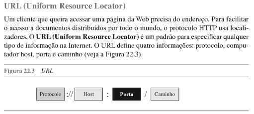URL (Uniform Resource Locator) é um endereço que facilita o acesso a documentos disponíveis nas páginas da Internet. Segundo o livro "Protocolo TCP/IP", de Behrouz A. Forouzan, Sophia Chung Fegan, a URL informa protocolo, host, porta e caminho: