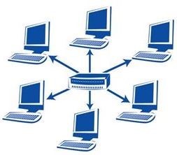 Trata-se da topologia em estrela (star, em inglês), na qual todos os computadores são conectados a um dispositivo concentrador de cabos (ou sinais de rádio, em redes sem fio), que recebe as informações e as envia a seus respectivos destinatários – na maioria dos casos, o dispositivo usado é um switch – como vemos na figura a seguir: